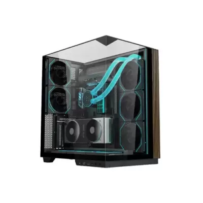 This case comes pre-installed with five ARGB fans—two 12cm ARGB fans on the rear and three 12cm reversed blades ARGB fans at the bottom with a built-in control hub. These fans provide superior airflow, keeping your system cool during long gaming sessions. The case also supports up to a 360mm radiator for liquid cooling solutions, ensuring optimal temperature management.