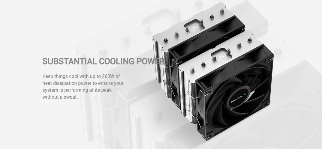 Deepcool AG620 120mm CPU Cooler is a dual-tower 120mm CPU cooler that boasts impressive 260W cooling power performance that’s been stripped down and optimized for terrific efficiency throughout. Keep things cool with up to 260W of heat dissipation power to ensure your system is performing at its peak without a sweat. By optimizing the internal capillary structure and injecting a precise amount of liquid, the heat pipe achieves the best heat dissipation performance regardless of whether the Deepcool AG620 cooler is in a vertical or horizontal case. This perfect ratio facilitates a highly efficient phase change throughout the heat pipe and achieves lower thermal resistance over a wide TDP range. Find your optimal balance with automatic PWM support for full performance under load to silent efficiency at idle. The included all-metal mounting brackets support both Intel and AMD platforms with an easy five-step installation process that maintains great contact pressure.