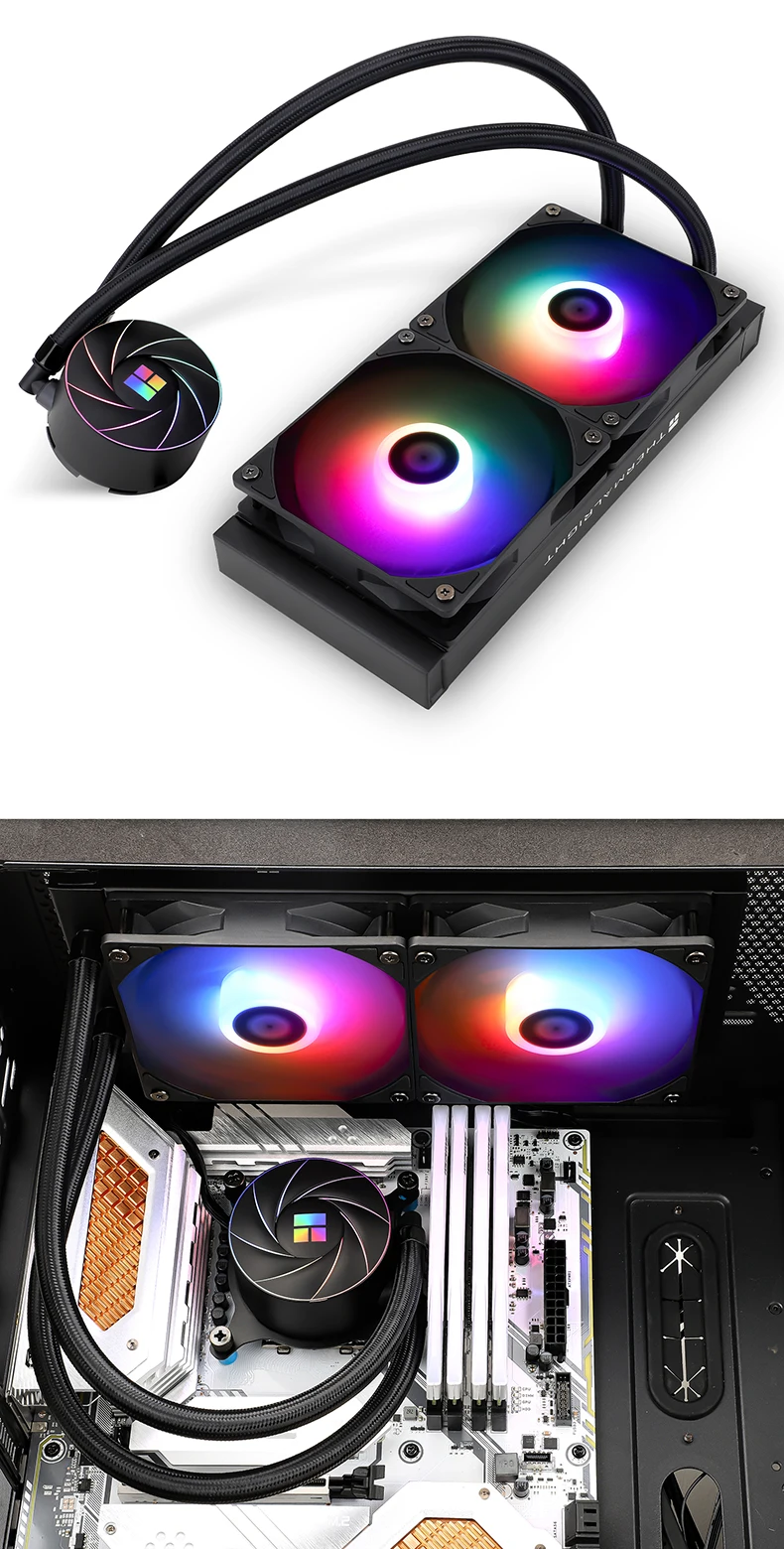 Thermalright Aqua Elite 240 Black ARGB All-in-One Water CPU Cooler, equipped with two Thermalright TL-C12C-S ARGB fans for optimal cooling performance. This water cooling solution boasts a sleek black design and features a 240mm aluminum radiator.