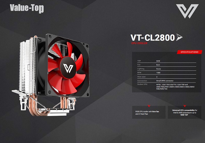 The Value Top VT-CL2800 boasts universal compatibility with both Intel and AMD processors, making it a trustworthy option for a broad spectrum of computer setups. Whether you're assembling a new system or upgrading an existing one, this cooler has you covered.ndable solution for efficient cooling.